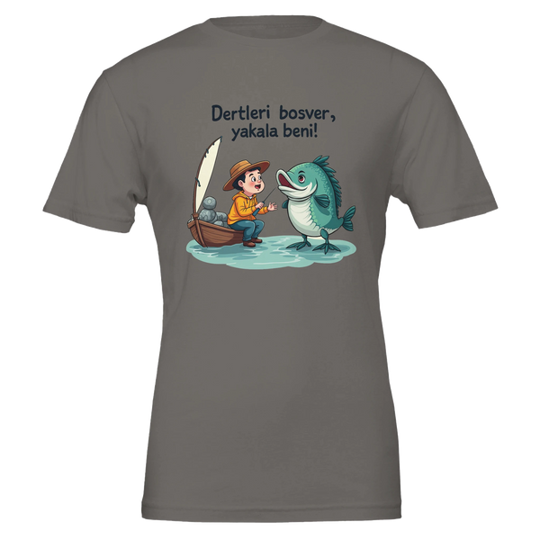 Embrace the carefree spirit of your next angling adventure with our “Dertleri Boşver, Yakala Beni!” T-Shirt. A whimsical illustration shows a young angler face-to-face with a friendly fish, inviting you to leave all worries behind. The design’s bright colors and playful vibe capture the joy and spontaneity of fishing. Crafted from soft, breathable cotton, it offers comfort whether you’re by the water or relaxing at home. Wear it with your favorite jeans or shorts and share your fun-loving attitude with the world. More than a shirt, it’s a bold statement to live in the moment. Cast your line, reel in happiness, and remember: when life feels heavy, let your worries go and focus on the catch, my friend. Embrace freedom.